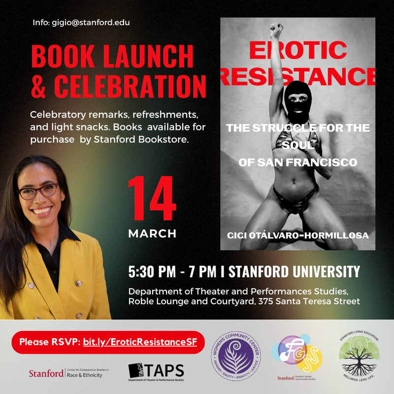 Join author Gigi Otálvaro-Hormillosa, co-sponsoring departments, and friends to celebrate the launch of her book, Erotic Resistance: The Struggle for the Soul of San Francisco (University of California Press, February 2024), at the Department of Theater and Performance Studies (Roble Lounge and the Courtyard).