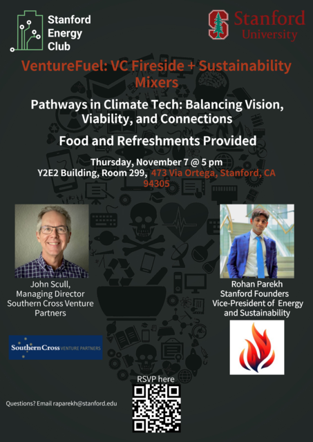 Join us for the third VC fireside chat and sustainability mixer in this speaker series with John Scull, Managing Director of Southern Cross Venture Partners, which focuses on renewable energy and cleantech investments. Scull, a 20-year VC veteran, is on the investment committee of Blackbird Ventures in Sydney and formerly was a venture partner at Allen & Buckeridge. Previously, Scull was CEO of Macromind (which became Macromedia, later acquired by Adobe) and PF Magic, with an early career as a marketing executive at Apple, where he helped launch the Macintosh. Discover key insights for balancing vision, viability, and connections in climate tech and sustainability, and enjoy some PIZZA and beverages!